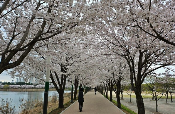 - 저수지 둘레를 따라 약 1.3km의 산책로가 조성되어 있습니다. 보행자 전용 도로와 자전거/조깅 도로가 잘 분리되어 있어 안전하게 운동을 즐길 수 있습니다. 특히 봄에는 호수를 둘러싼 수백 그루의 벚꽃나무가 터널을 이루어 '수원 8경'에 버금가는 절경을 선사하며, 밤에는 은은한 야간 조명이 수면에 반사되어 낭만적인 분위기를 연출합니다.