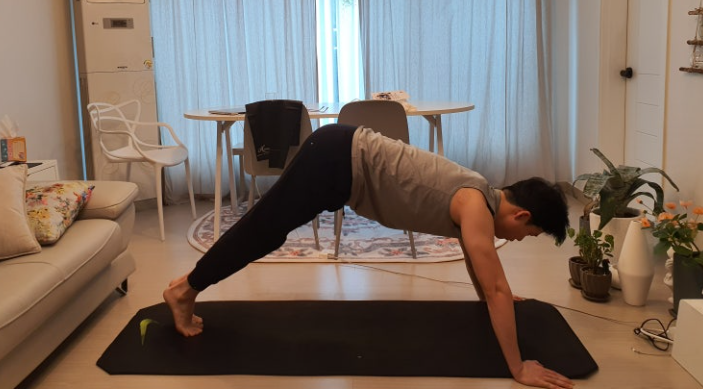 - 하는 법: 양팔꿈치와 발끝으로 몸을 지탱하고, 머리부터 발끝까지 일직선을 만듭니다. 엉덩이가 너무 올라가거나 처지지 않도록 주의하세요. 30초씩 3세트 반복.