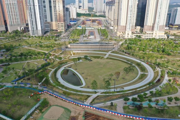 공원의 북측에는 아이들을 위한 테마 놀이터가 위치합니다. 일반적인 놀이 기구 외에도 지형을 활용한 놀이 시설들이 배치되어 있어 아이들의 모험심을 자극합니다. 인근에는 여름철 시원하게 가동되는 바닥분수와 수변 공간이 있어, 물놀이를 즐기려는 가족들로 활기가 넘칩니다.