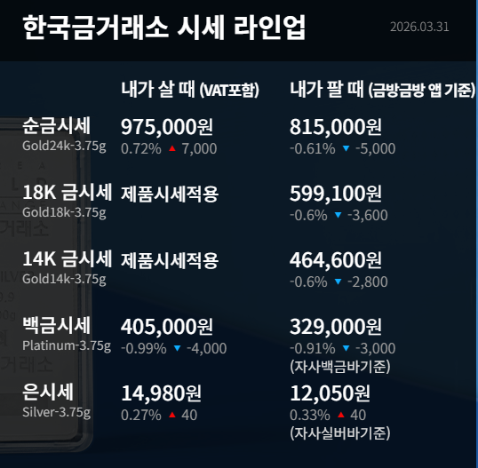 • 국내 금 시세: 환율 변동성이 더해지며 국내 금 시세는 여전히 고공행진 중입니다. 3월 31일 기준, 순금 한 돈(3.75g) 살 때 가격은 약 965,000원 전후, 팔 때 가격은 835,000원 선을 유지하고 있습니다. 금값 '한 돈 100만 원' 시대에 대한 심리적 저항감이 매수세와 팽팽하게 맞서고 있습니다.