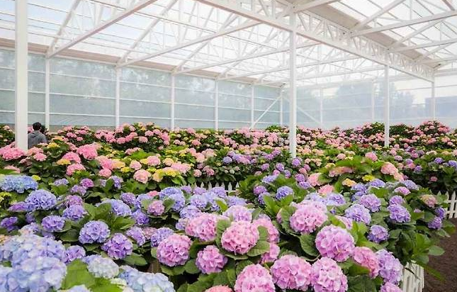 5월 휴애리의 주인공은 단연 온실입니다. 기온 조절을 통해 일찍 꽃을 피운 형형색색의 유럽 수국과 산수국들이 빽빽하게 들어차 있습니다. 날씨와 상관없이 쾌적하게 관람할 수 있으며, 층층이 쌓인 수국 벽은 최고의 포토존입니다.